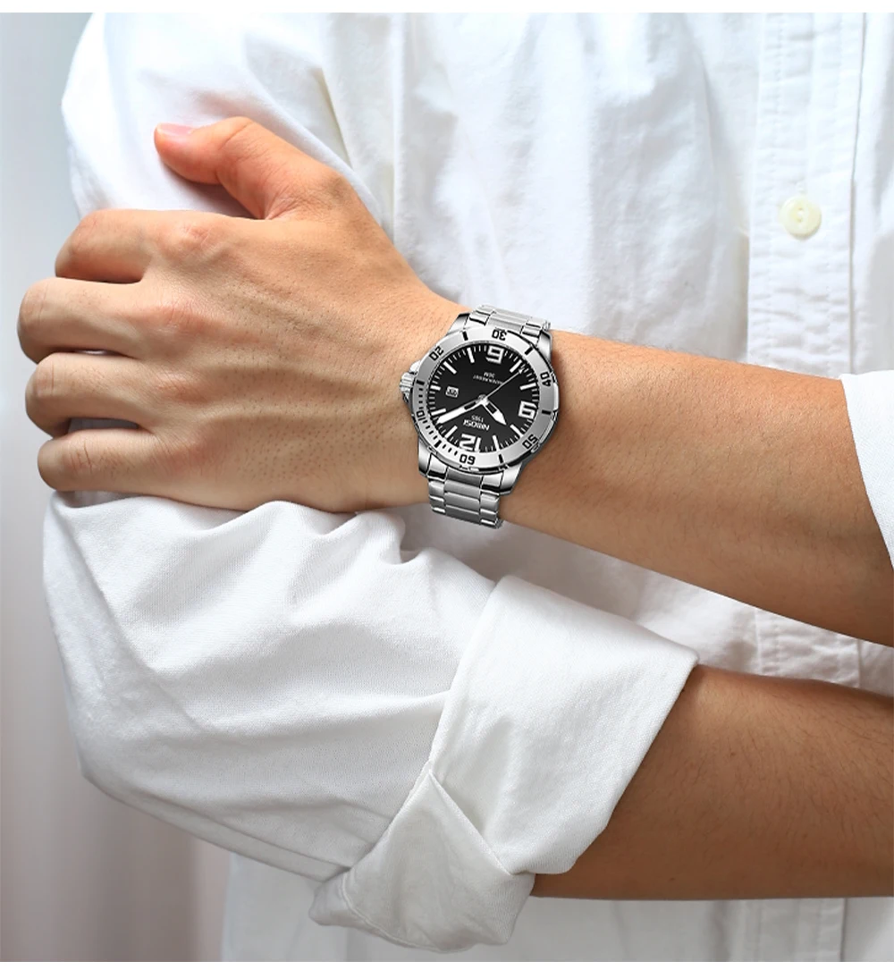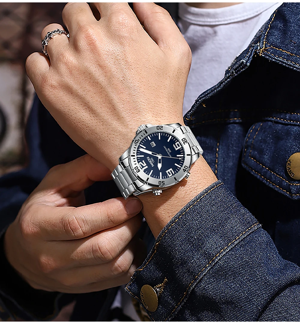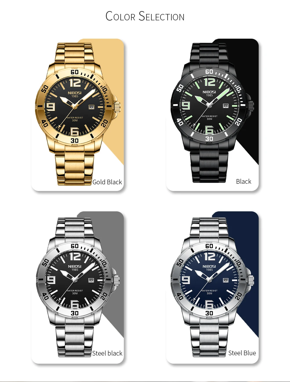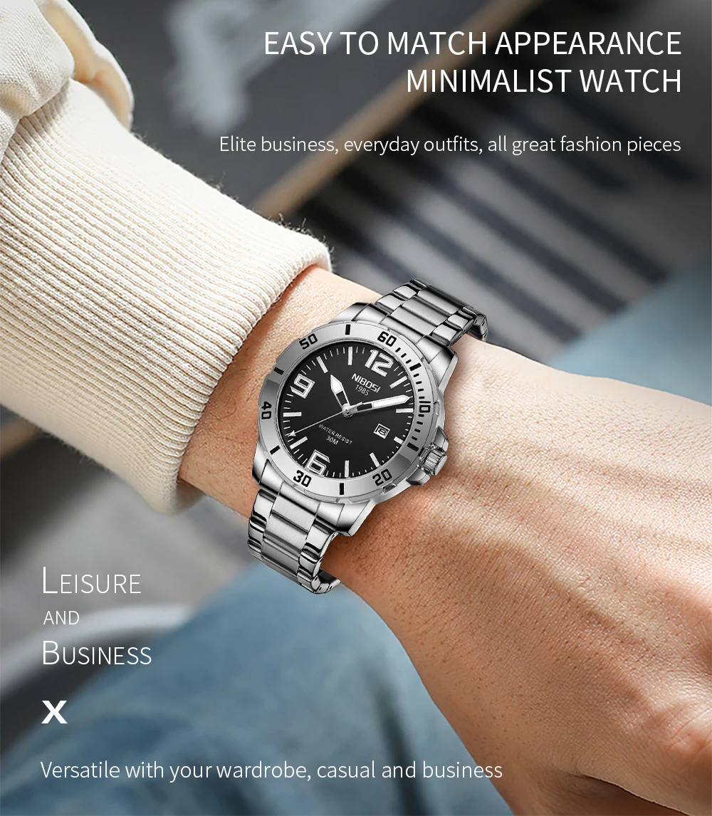 Este é um relógio automático da marca NIBOSI que combina estilo e funcionalidade. Com um design elegante e simples, possui caixa e pulseira feitas de aço inoxidável, garantindo durabilidade e um visual sofisticado. O visor de vidro Hardlex oferece resistência a riscos, enquanto os ponteiros luminosos garantem a visibilidade em ambientes com pouca luz.